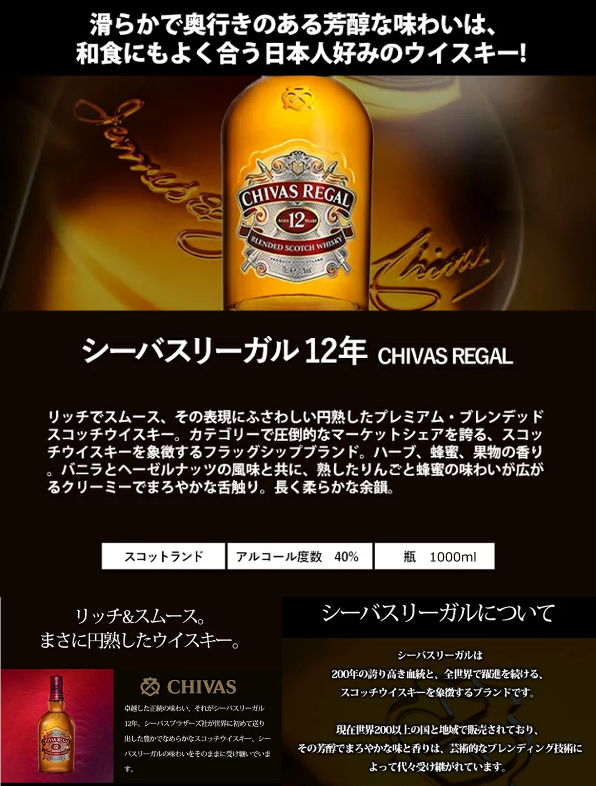 シーバスリーガル12年のお得なLサイズ。とても飲みやすく繊細でまろやかな味わいが存分に楽しめます。