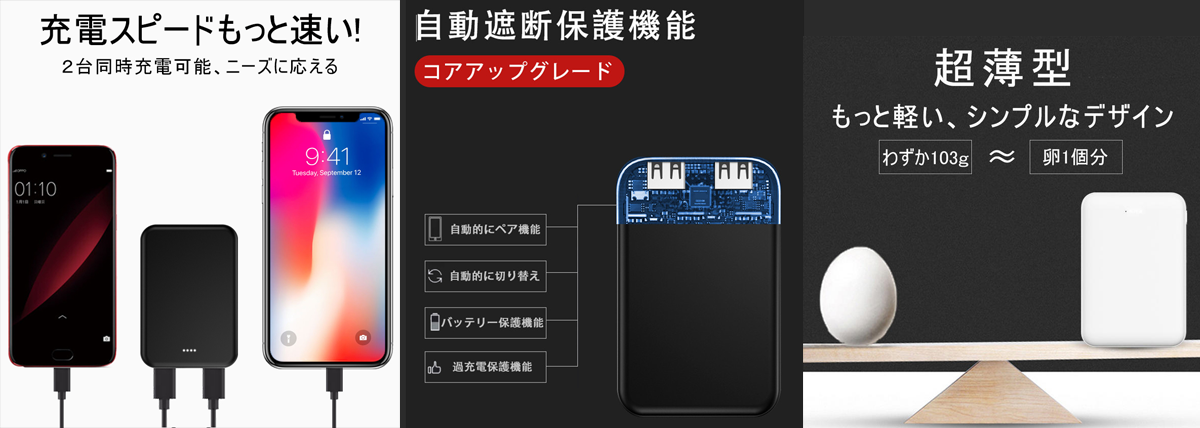 2USB出力ポートを通じて、iPad、iPhone、Android端末等の複数の機器を、同時充電することができ、最大2.1Aで急速充電可能です。USBケーブルを変更しなく、ただ一本で本体に充電できます。本当に便利でした。